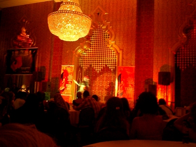 上課囉!我的第一堂課是FARIDA FAHMY的大師(見此模糊圖)課程。聽說她是讓肚皮舞變成令人尊敬的行業的重要人物。有別於其他的老師,她不教舞碼,而是從暖身的動作到基本肚皮舞動作跟組合近乎吹毛求疵地要求學生修正。這是我喜歡的風格,我一向不喜歡上舞碼,喜歡基本動作的訓練。她的英文很好,用詞非常精確。還帶了巴西著名舞者LuLu Sabongi當助教。她示範正面的動作,LuLu示範背面的動作,(因為沒有鏡子)果然是個專業負責的好老師。
